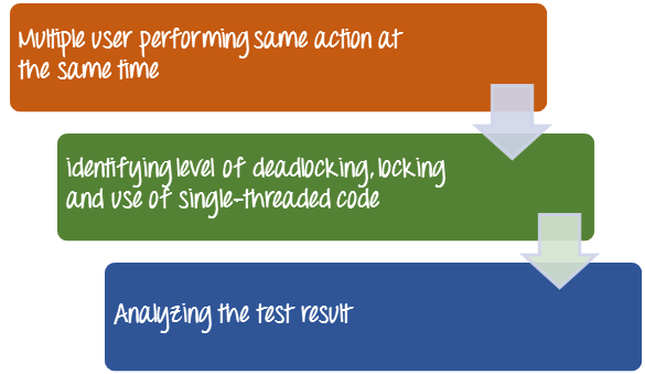 Concurrency Testing is defined as a testing technique to detect the defects in an application when multiple users are logged in. In other words monitoring the effect while multiple users perform the same action at the same time. The image below show the concurrent testing