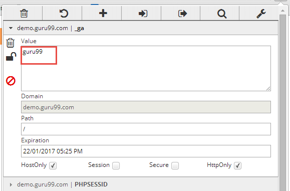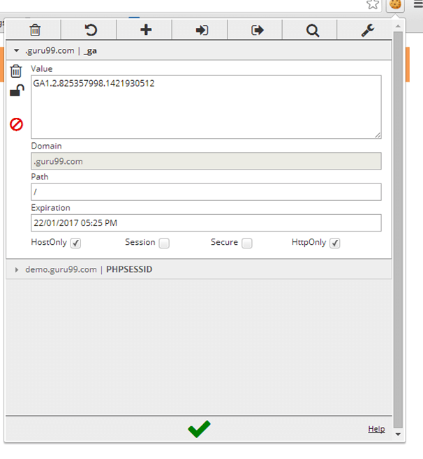 Cookie Testing is defined as a Software Testing type that checks Cookie created in your web browser. A cookie is a small piece of information that is stored in a text file on user's (client) hard drive by the web server. This piece of information is then sent back to the server each time the browser requests a page from the server. Usually, cookie contains personalized user data or information that is used to communicate between different web pages. The screen-shot below shows cookies for different websites.