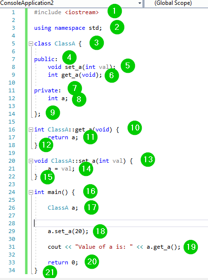 - Use the class name and the scope resolution operator to access the function get_a(). We want to define what the function does when invoked.