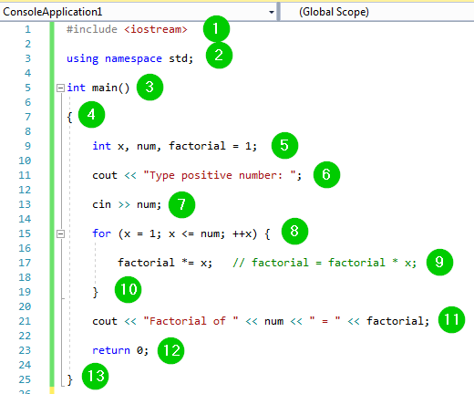 Declaring integer variables, x, num, and factorial. The variable factorial has been assigned a value of 1.