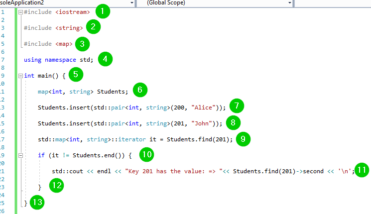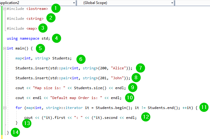 - Insert values into the map Students. A key of 200 and a value of Alice will be inserted into the map.