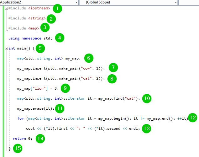 - Create a map named m where the keys will be integers, and the values will be integers. Three entries have been made into the map.