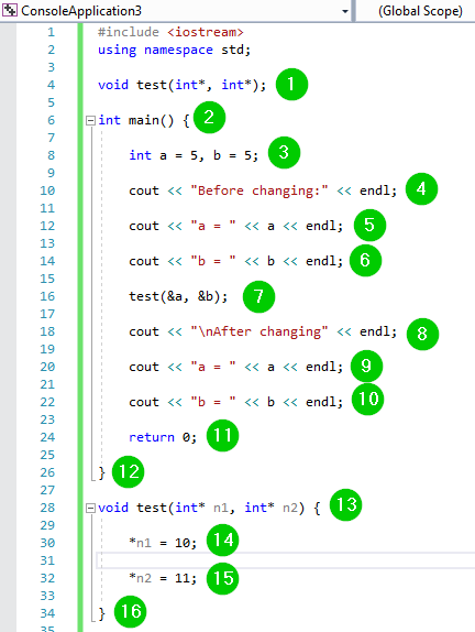 In the above case, the function 'test' has the address of variables 'a' and 'b.' These two variables are directly accessible from the function 'test', and hence any change done to these variables are reflected in the caller function 'main.'