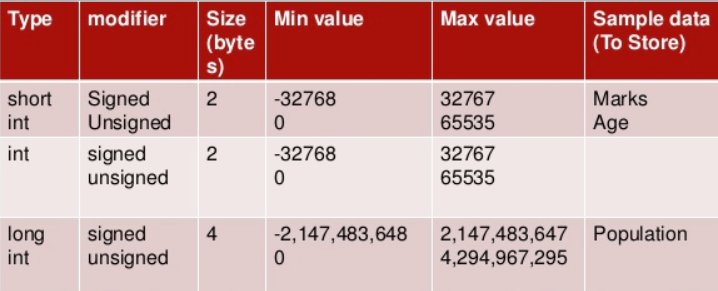 Signed Type: They represent negative or positive numbers (including zero). In a signed type, the range must be evenly divided between +ve and -ve values. Thus, an 8-bit signed char will hold values from –127 through 127.