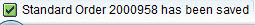 A Message "Standard Order 2000958 has been saved " is displayed.
