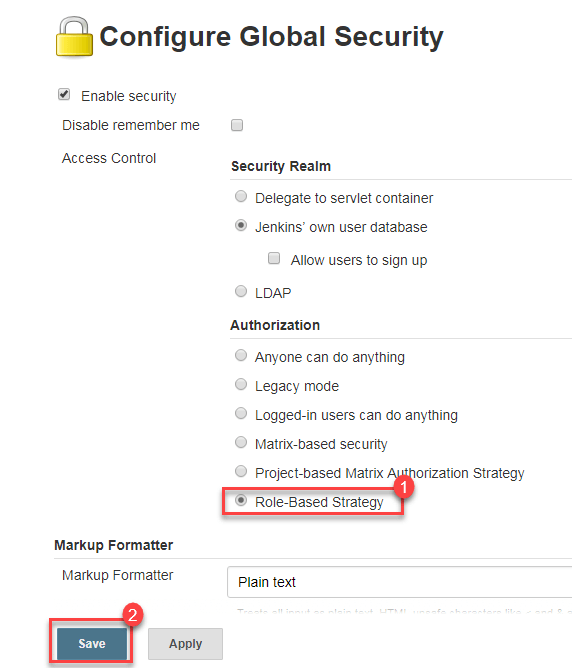 Step 4) Go to Manage Jenkins -> Configure Global Security -> Under Authorization, select Role Based Strategy. Click on Save.