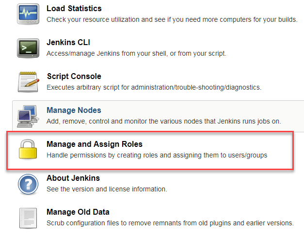 Note: that the Manage and Assign Roles option will only be visible if you've installed the role strategy plugin.