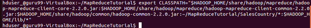 export CLASSPATH="$HADOOP_HOME/share/hadoop/mapreduce/hadoop-mapreduce-client-core-2.2.0.jar:$HADOOP_HOME/share/hadoop/mapreduce/hadoop-mapreduce-client-common-2.2.0.jar:$HADOOP_HOME/share/hadoop/common/hadoop-common-2.2.0.jar:~/MapReduceTutorial/SalesCountry/*:$HADOOP_HOME/lib/*"