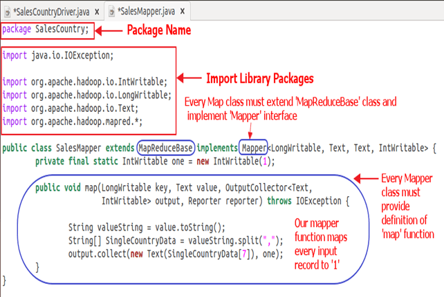 1. We begin by specifying a name of package for our class. SalesCountry is a name of our package. Please note that output of compilation, SalesMapper.class will go into a directory named by this package name: SalesCountry.