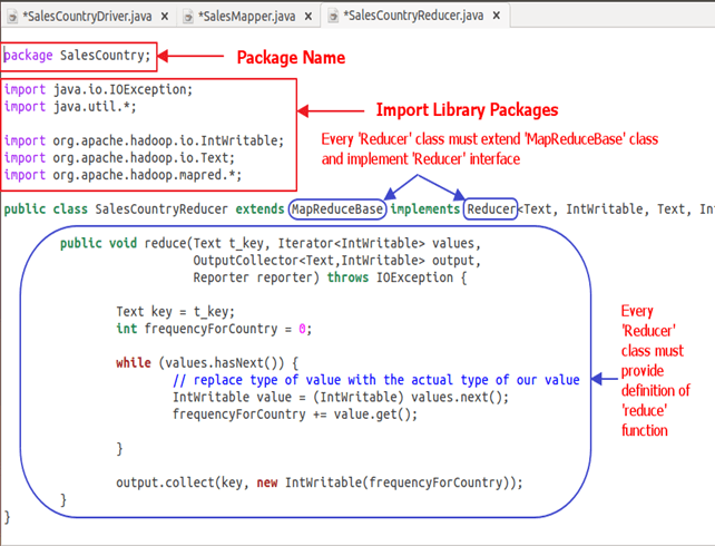 1. We begin by specifying a name of the package for our class. SalesCountry is a name of out package. Please note that output of compilation, SalesCountryReducer.class will go into a directory named by this package name: SalesCountry.
