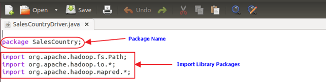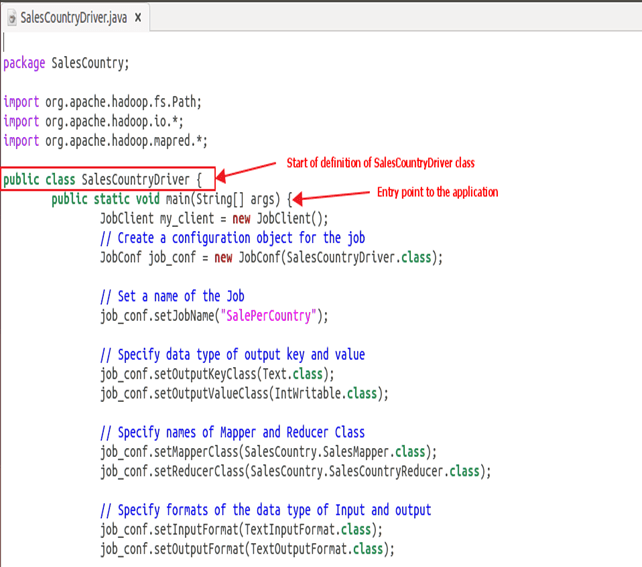 1. We begin by specifying a name of package for our class. SalesCountry is a name of out package. Please note that output of compilation, SalesCountryDriver.class will go into directory named by this package name: SalesCountry.