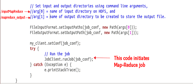 The driver class is responsible for setting our MapReduce job to run in Hadoop. In this class, we specify job name, data type of input/output and names of mapper and reducer classes.