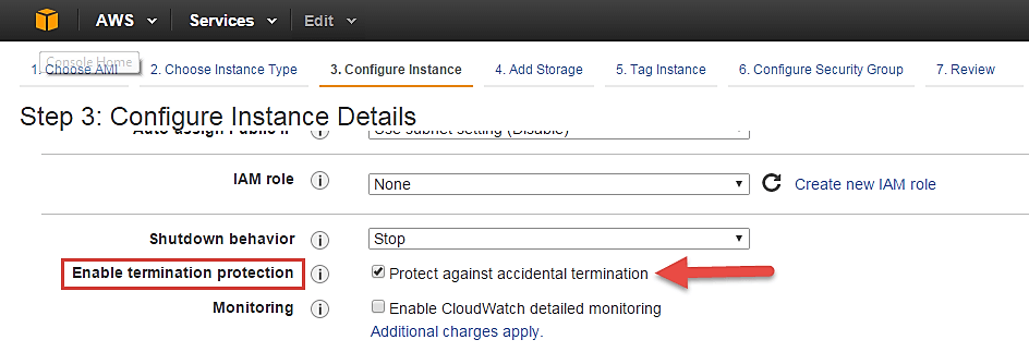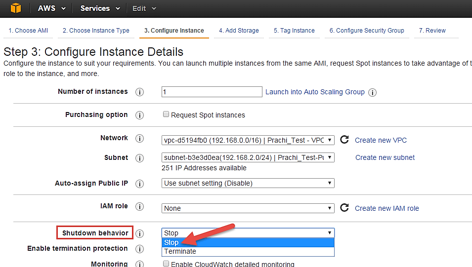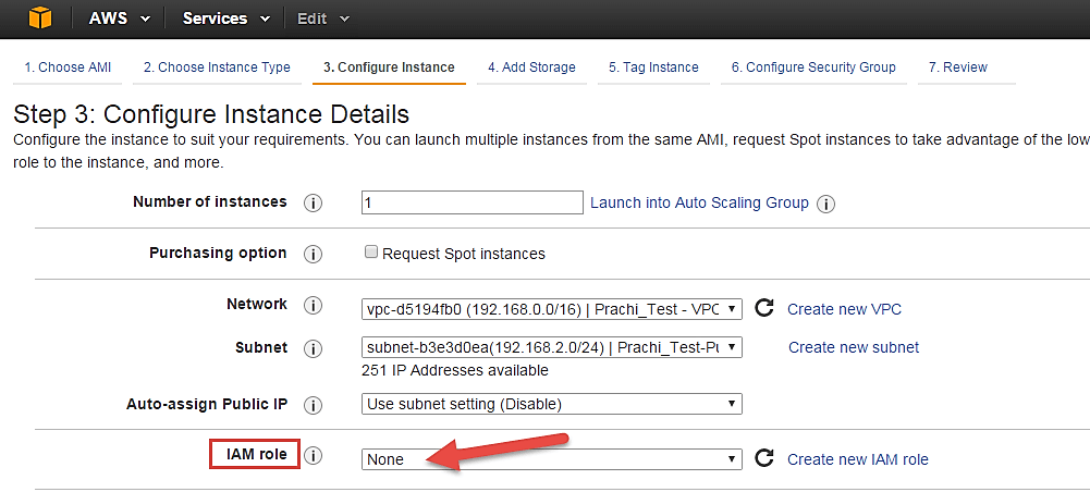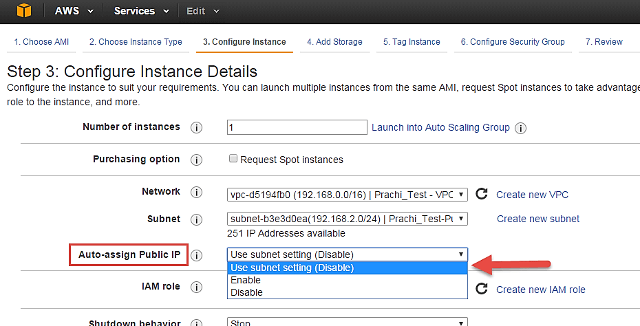 Step 6) Public IP- we'll choose to assign the instance a public IP as soon as it launches. In this step, you can choose if you want AWS to assign it an IP automatically, or you want to do it manually later. You can enable/ disable 'Auto assign Public IP' feature here likewise.