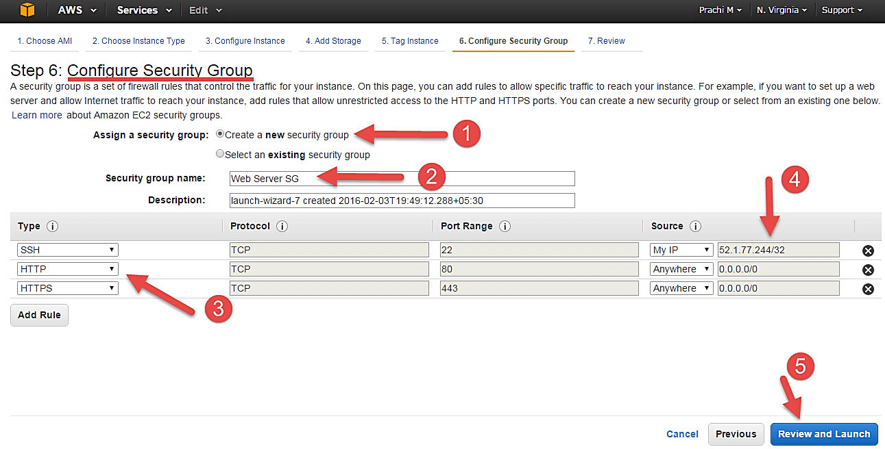 Step 1) In this next step of configuring Security Groups, you can restrict traffic on your instance ports. This is an added firewall mechanism provided by AWS apart from your instance's OS firewall.