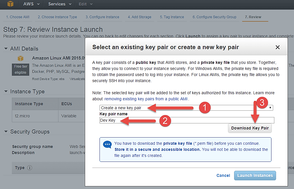 Step 2) In the next step you will be asked to create a key pair to login to you an instance. A key pair is a set of public-private keys.