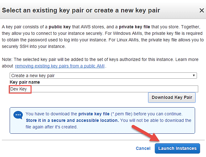 Step 3) Once you are done downloading and saving your key, launch your instance.