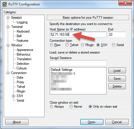 Step 7) Now open putty from your programs list and add your same EIP in there as below.