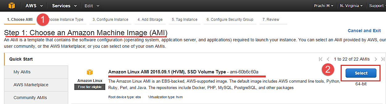 Step 1) Select an AMI- an AMI is a template consisting of the OS platform and software to be installed in the instance. Select your desired AMI from the existing list. We are selecting Amazon Linux AMI for this tutorial.
