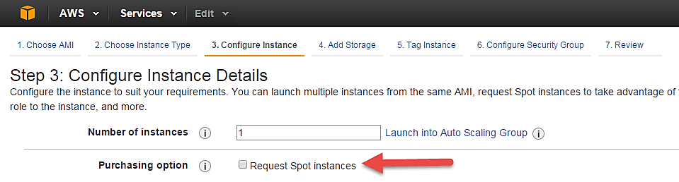 Step 2) Under Purchasing Options, keep the option of 'Request Spot Instances' unchecked as of now. (This is done when we wish to launch Spot instances instead of on-demand ones. We will come back to Spot instances in the later part of the tutorial).