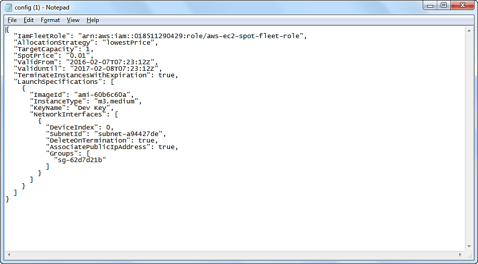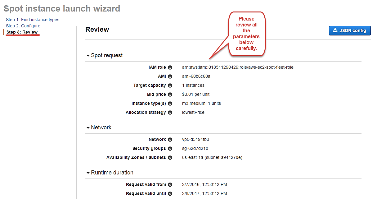 Once we are done configuring our spot instance request in the 2 steps earlier in our wizard, we'll take a look at the overall configuration.