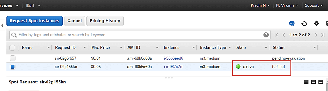 After a couple of minutes, you can see that the state is changed to 'active', and now our spot request is successfully fulfilled. You can note the configuration parameters below.