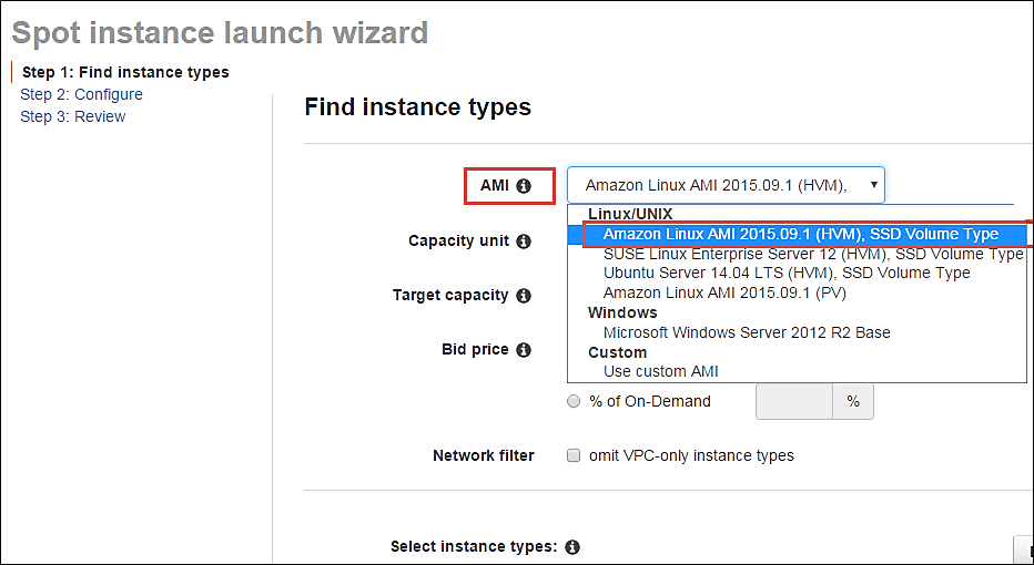 Spot instance launch wizard will open up. You can now go ahead with selecting the parameters and the instance configuration.
