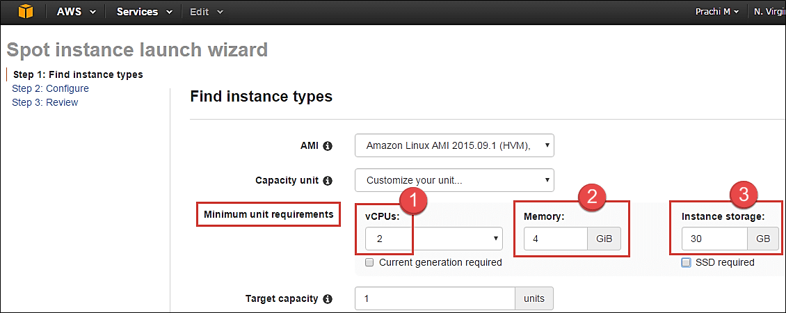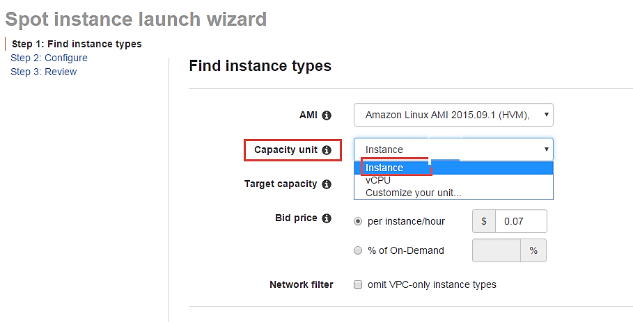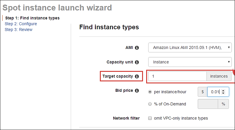 Step 3) Target Capacity depicts how many spot instances you wish to maintain in your request. Here we are selecting one.