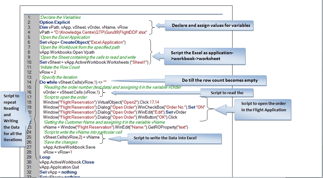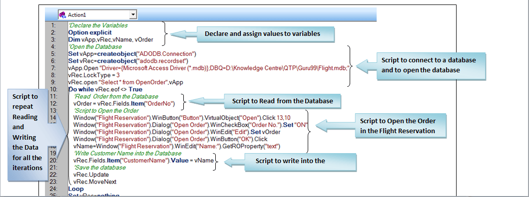 Below script is to read the order number from the Excel and assign it into the application through variable “vOrder” and write the customer name from the application through variable “vName”.