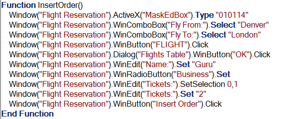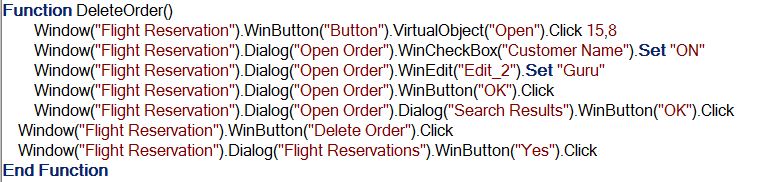 Our aim is to run a single test for five different test cases such as login into the application, insert an order, open an order, delete an order and close the application. Hence, we will record the test steps for these test cases and create the functions with keywords Login, InsertOrder, OpenOrder, DeleteOrder and CloseApp respectively.