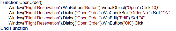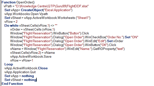 In this article, the same test cases that are used in KDF will be executed in a single test. The Keywords and the scripts for all the test cases are same as in KDF. However, TC3: Open the order has been parameterized. Hence the script for this test case is written to receive the order number from an Excel file and to write the customer name into the excel file
