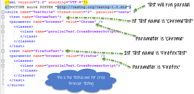 <?xml version="1.0" encoding="UTF-8"?> <!DOCTYPE suite SYSTEM "http://testng.org/testng-1.0.dtd"> <suite name="TestSuite" thread-count="2" parallel="tests" > <test name="ChromeTest"> <parameter name="browser" value="Chrome" /> <classes> <class name="parallelTest.CrossBrowserScript"> </class> </classes> </test> <test name="FirefoxTest"> <parameter name="browser" value="Firefox" /> <classes> <class name="parallelTest.CrossBrowserScript"> </class> </classes> </test> <test name="EdgeTest"> <parameter name="browser" value="Edge" /> <classes> <class name="parallelTest.CrossBrowserScript"> </class> </classes> </test> </suite>
