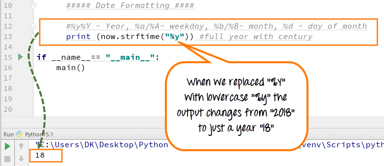 Step 2) Now if you replace ("%Y") with lowercase, i.e., ( "%y) and execute the code the output will display only (18) and not (2018). The century of the year will not display as shown in the screenshot below