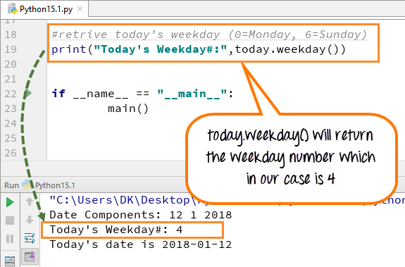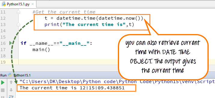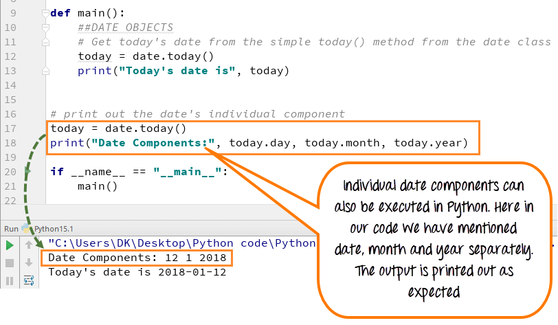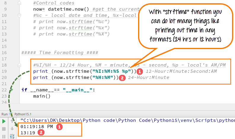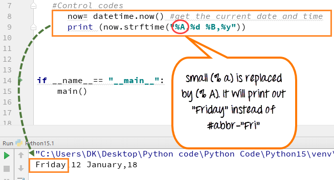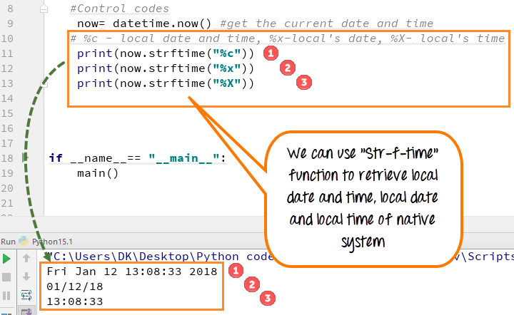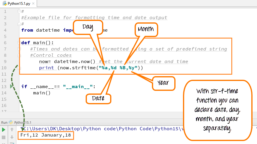 main()As of now we have learned, how to use datetime and date object in Python. We will advance a step further and learn how to use a formatting function to format Time and Date.