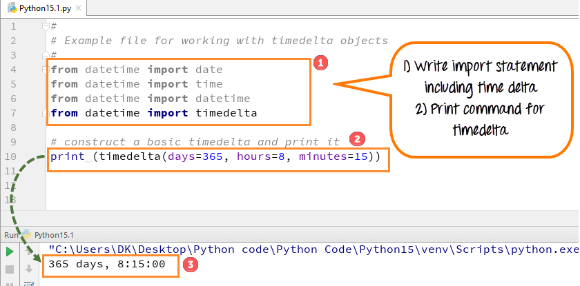 Step 1) To run Timedelta Objects, you need to declare the import statement first and then execute the code