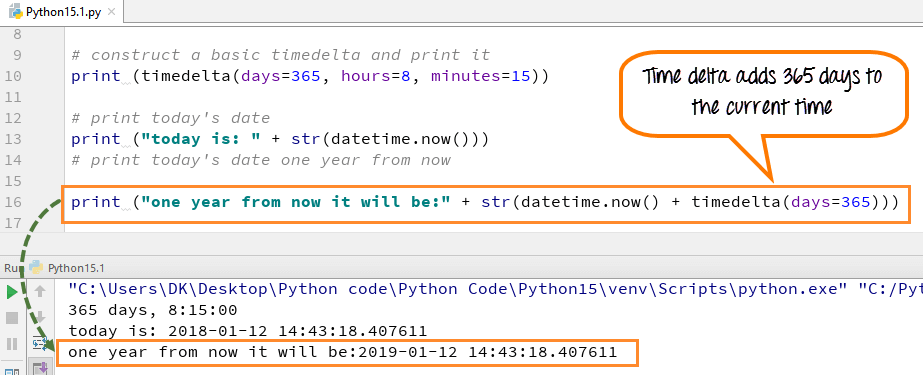 print ("one year from now it will be:" + str(datetime.now() + timedelta(days=365)))