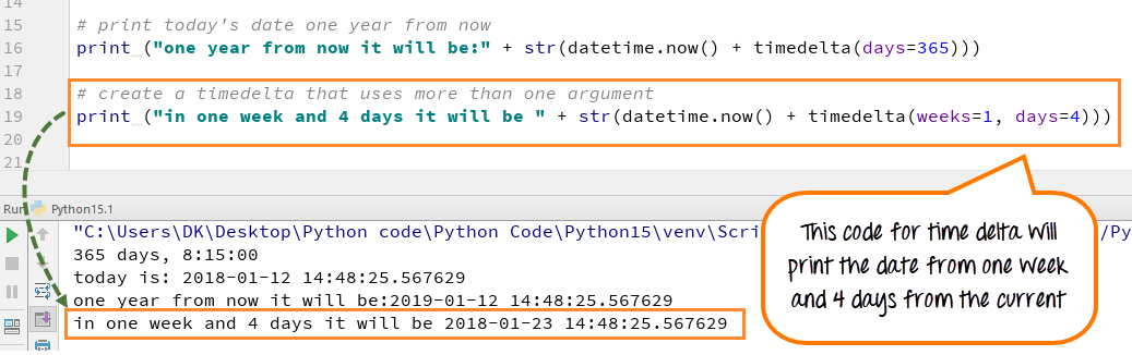 # print (in one week and 4 days it will be " + str(datetime.now() + timedelta(weeks=1, days=4)))