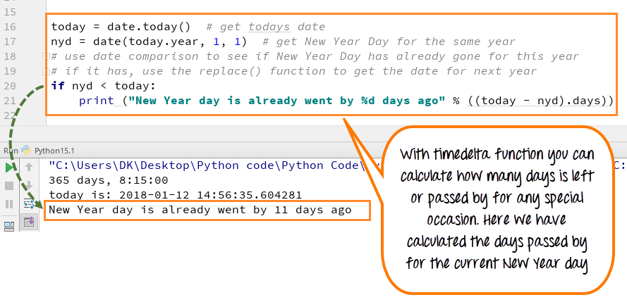 print "New Year day is already went by %d days ago" % ((today - nyd).days)For manipulating dates and times in both simple and complex ways datetime module supplies different classes or categories like