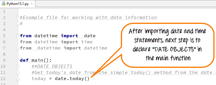 This line tells the Python interpreter to import the date class from the datetime module in Python. We are not writing the code for this date functionality alas just importing it for our use