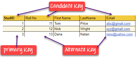 In this table, StudID, Roll No, Email are qualified to become a primary key. But since StudID is the primary key, Roll No, Email becomes the alternative key.