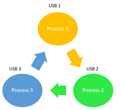 For example, a computer has three USB drives and three processes. Each of the three processes able to holds one of the USB drives. So, when each process requests another drive, the three processes will have the deadlock situation as each process will be waiting for the USB drive to release, which is currently in use. This will result in a circular chain.