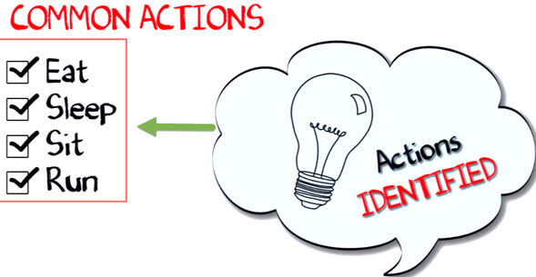 Next, list out the common behaviors of these dogs like sleep, sit, eat, etc. So these will be the actions of our software objects.