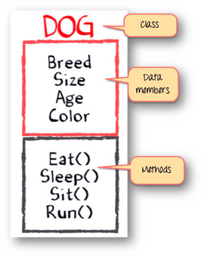 Some of the differences you might have listed out maybe breed, age, size, color, etc. If you think for a minute, these differences are also some common characteristics shared by these dogs. These characteristics (breed, age, size, color) can form a data members for your object.