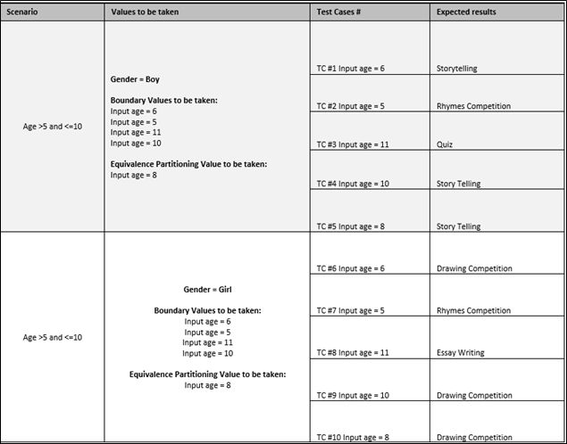 | Boy - Age >10 and <=15 | Input age = 11 Input age = 10 Input age = 15 Input age = 16 | Input age = 13 |