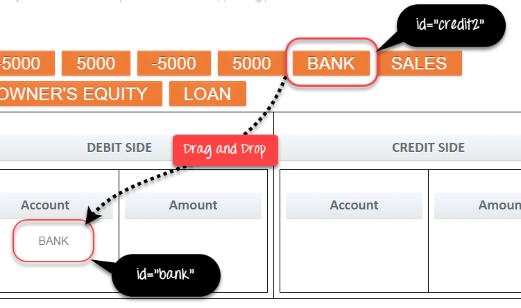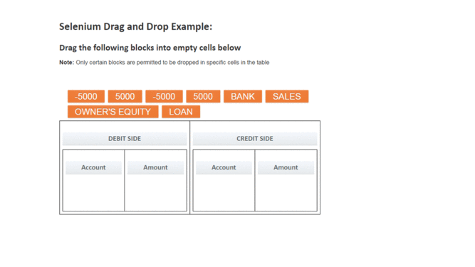 In this scenario, we launch the given URL in the browser and then drag the BANK element and drop on the DEBIT SIDE block through dragAndDropBy method. To dragAndDropBy, we need to find the pixel of the element.