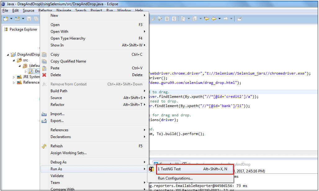 Code Explanation: In the above code we launch the given URL in Firefox browser and then drag the BANK element and drop on the DEBIT SIDE block through dragAndDrop method. Explained briefly below: