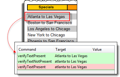 In the scenario above, "Atlanta to Las Vegas" was treated differently from "atlanta to Las Vegas" because the letter "A" of "Atlanta" was in uppercase on the first one while lowercase on the other. When the verifyTextPresent command was used on each of them, one passed while the other failed.