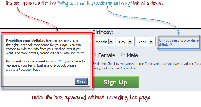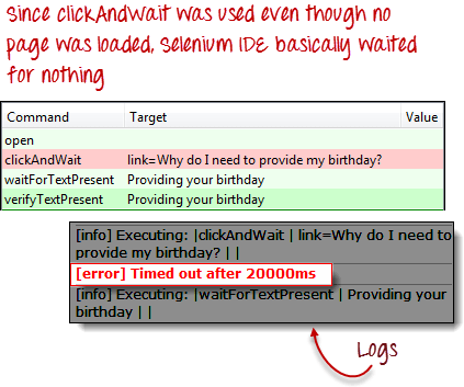 We cannot use clickAndWait because no page was loaded upon clicking on the "Why do I need to provide my birthday?" link. If we do, the test will fail
