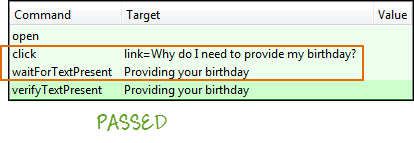 We can use a combination of "click" and "waitForTextPresent" to verify the presence of the text "Providing your birthday."