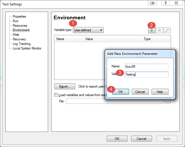 External variables can be loaded in two ways. It can be done manually before executing the test through environment tab or user-defined screen by inspecting the load variables check box and then by selecting the XML file.