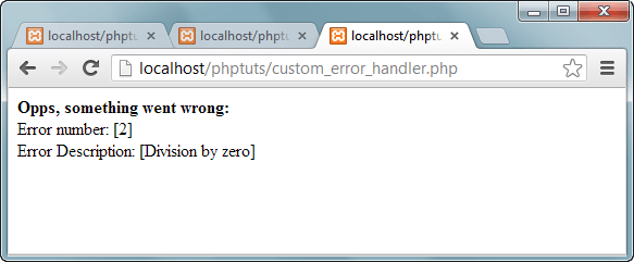 ?>Open the URL http://localhost/phptuts/custom_error_handler.php you will get the following results